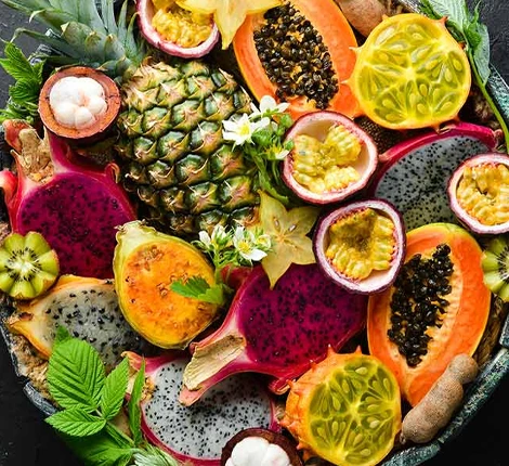 Mangoes and papayas bursting with sweet juice offer refreshing natural snacks.